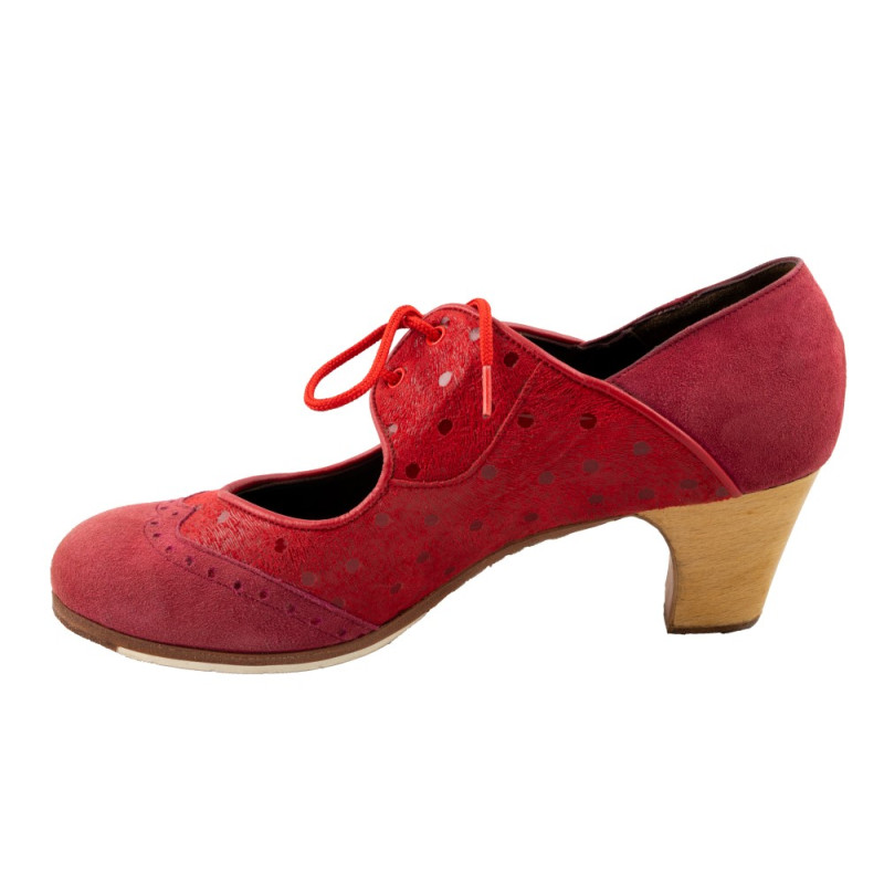 Zapato de flamenco de línea abotinado sujeto con cordones en el empeine pero picado en la parte delantera y trasera y con posibilidad de combinar distintos materiales. Fabricado en piel bovina de primera calidad, lleva filis antideslizantes y numerosos clavos en punta y tacón. Se fabrica a mano tanto en la serie A (Standard) como en Serie P (Profesional) y admite gran variedad de colores y tacones.